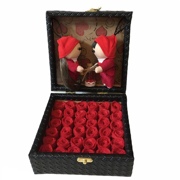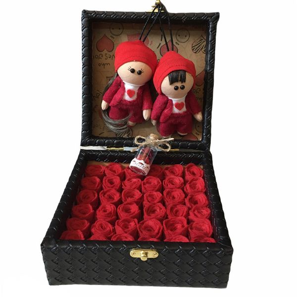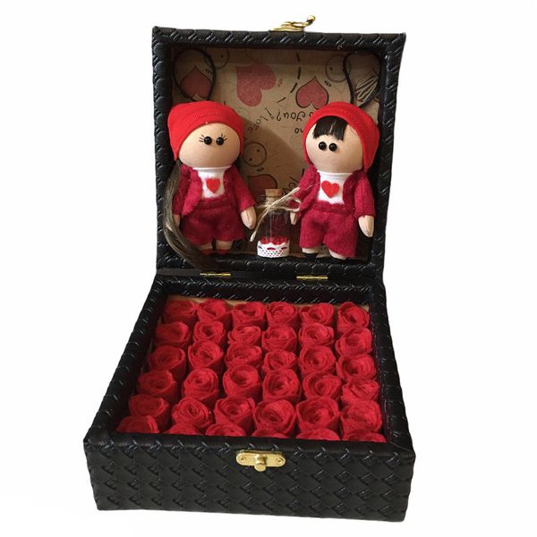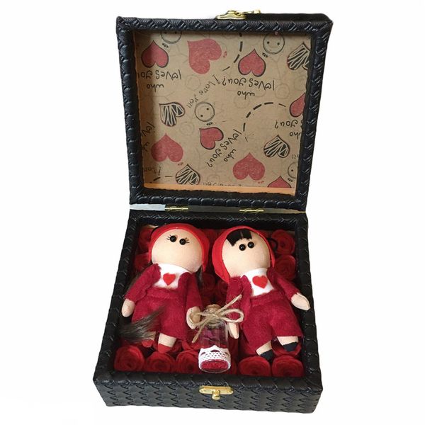 این ست هدیه شامل یک باکس چوبی قفل‌دار با روکش چرم به ابعاد 20x20x9 سانتی‌متر، دو عروسک روسی دختر و پسر به ارتفاع 12 سانتی‌متر با دست‌های متحرک، یک شیشه تزیینی و 36 گل نمدی زیبا است. ترکیب این اجزا، هدیه‌ای جذاب و منحصر به فرد برای عزیزانتان می‌سازد.